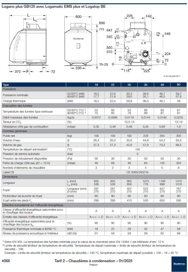 Chaudière mazout en fonte à condensation Logano GB125/30kW avec brûleur 1 allure flamme bleue, régulation climatique EMS incluse avec thermostat RC300 et sonde extérieure, isolation thermique périphérique constituée de 80 mm de fibre minérale, pieds réglables, évacuation cheminée DN80/125. Rendement 104%(PCI)-98%(PCS).